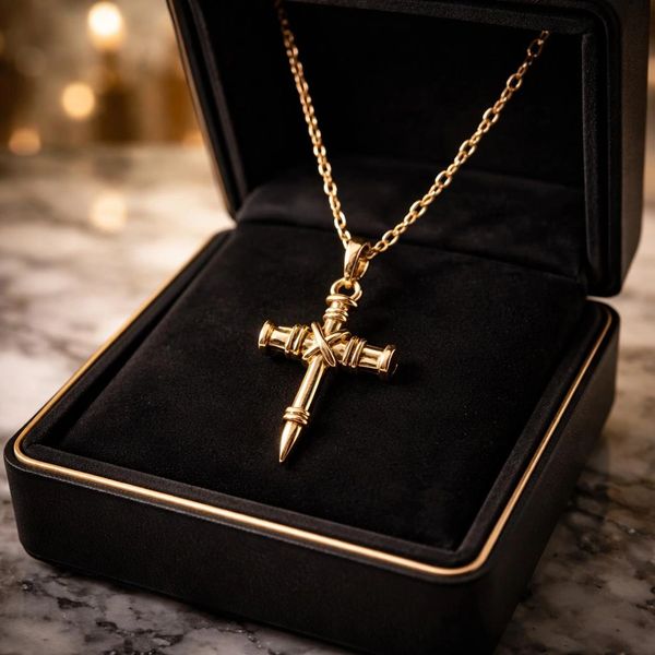 Cross of nails necklace. Cross is 1.5"L x .75"W. Chain is 24" in length and is available in gold or silver plated stainless steel cable chain. Necklace is available in Gold or Silver.