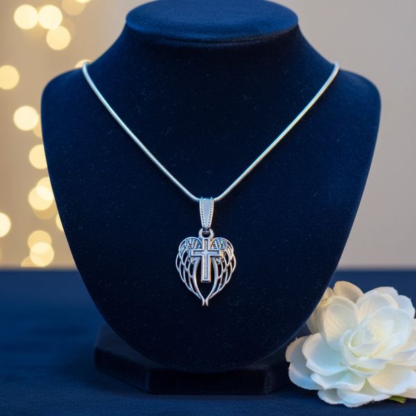 Silver-toned Angel Wing and Cross Necklace on silver-toned 24" snake chain. Pendant .75"x.75"